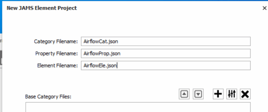 Provide names for the Category, Property and Element filenames. You will notice that these files all have the extension .json. JAMS stores its definitions in the JAMS database as JSON data. In theory one could directly edit these files, but it’s much easier to use JAMSElementEditor.