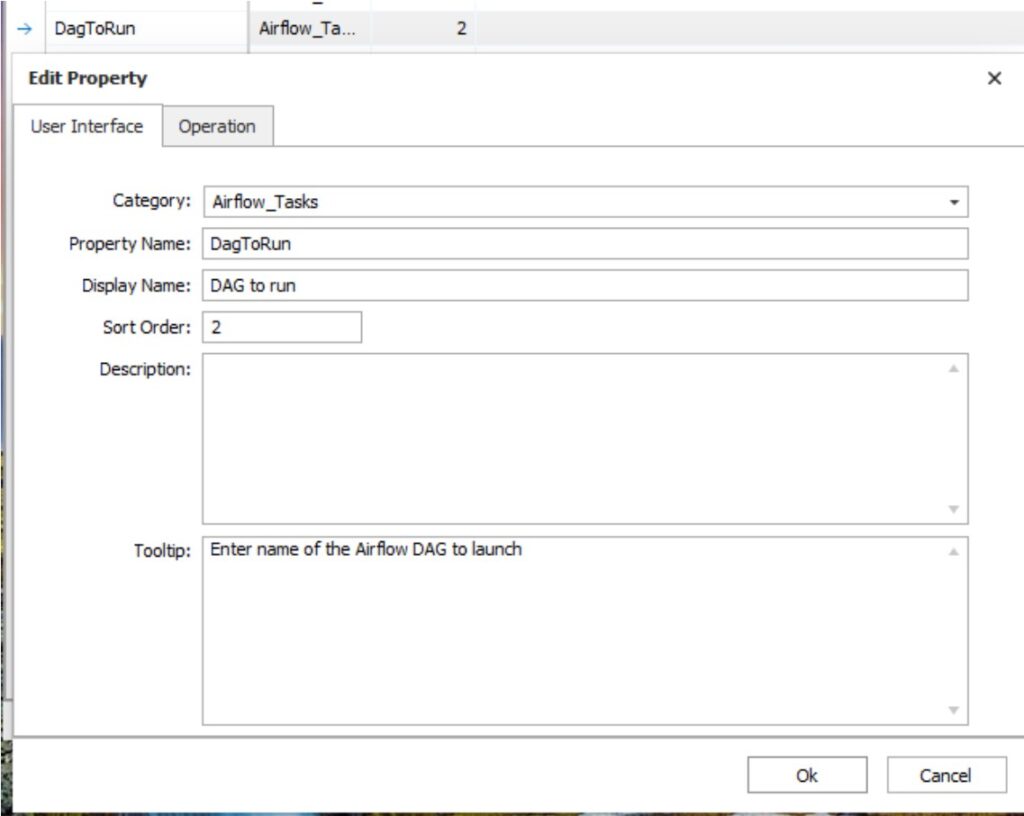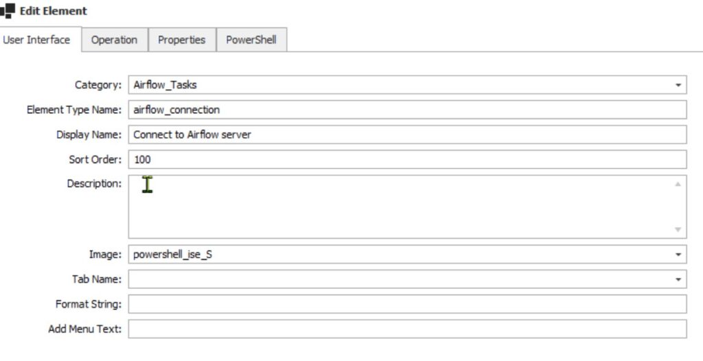The Properties tab is where we define the properties that we want to use in this particular task. In this case the AirflowHostURI and the AirflowUser properties. We also identify the same Parameters as attributes of PSScriptParams. This ensures that the system passes the parameters into the PowerShell script.