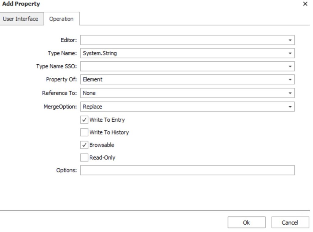 The next tab is the Properties tab. This is where we define the properties that we want to appear on the Properties sheet for a specific element. There are two tabs associated with a Property. On the second tab, Operation, only select the checkboxes as illustrated below.