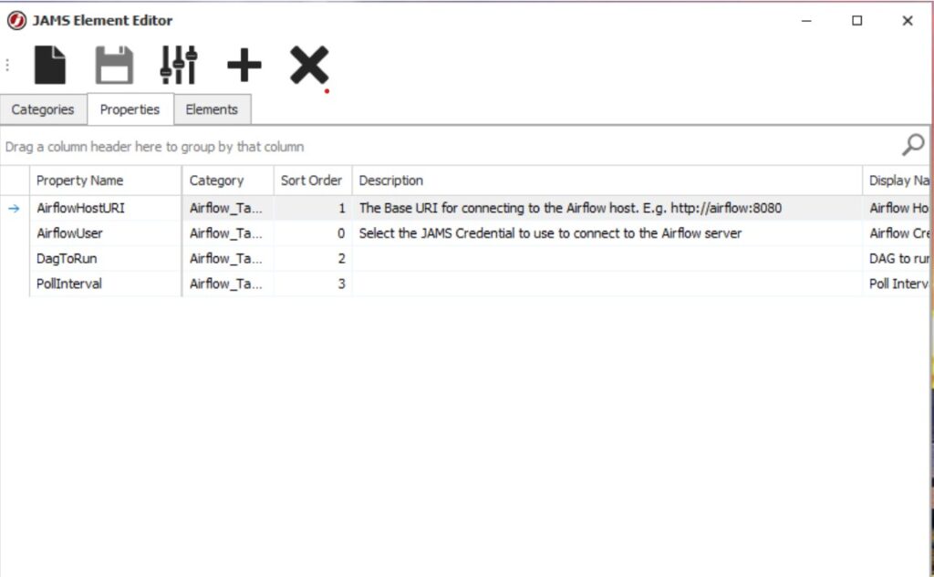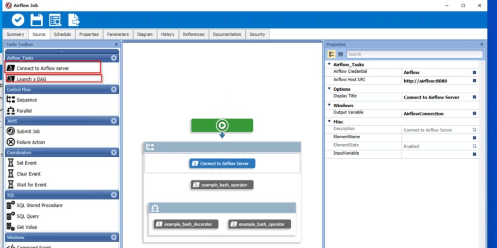 We want to build a Sequence Task that we can use in many Sequences and that appears in the Sequence Editor as a definition that we can drag and drop. In our example we are going to create an integration to a popular data orchestration product, Airflow. Before we discuss building the integration and using JAMSElementEditor, let’s take a look at what the finished integration looks like: